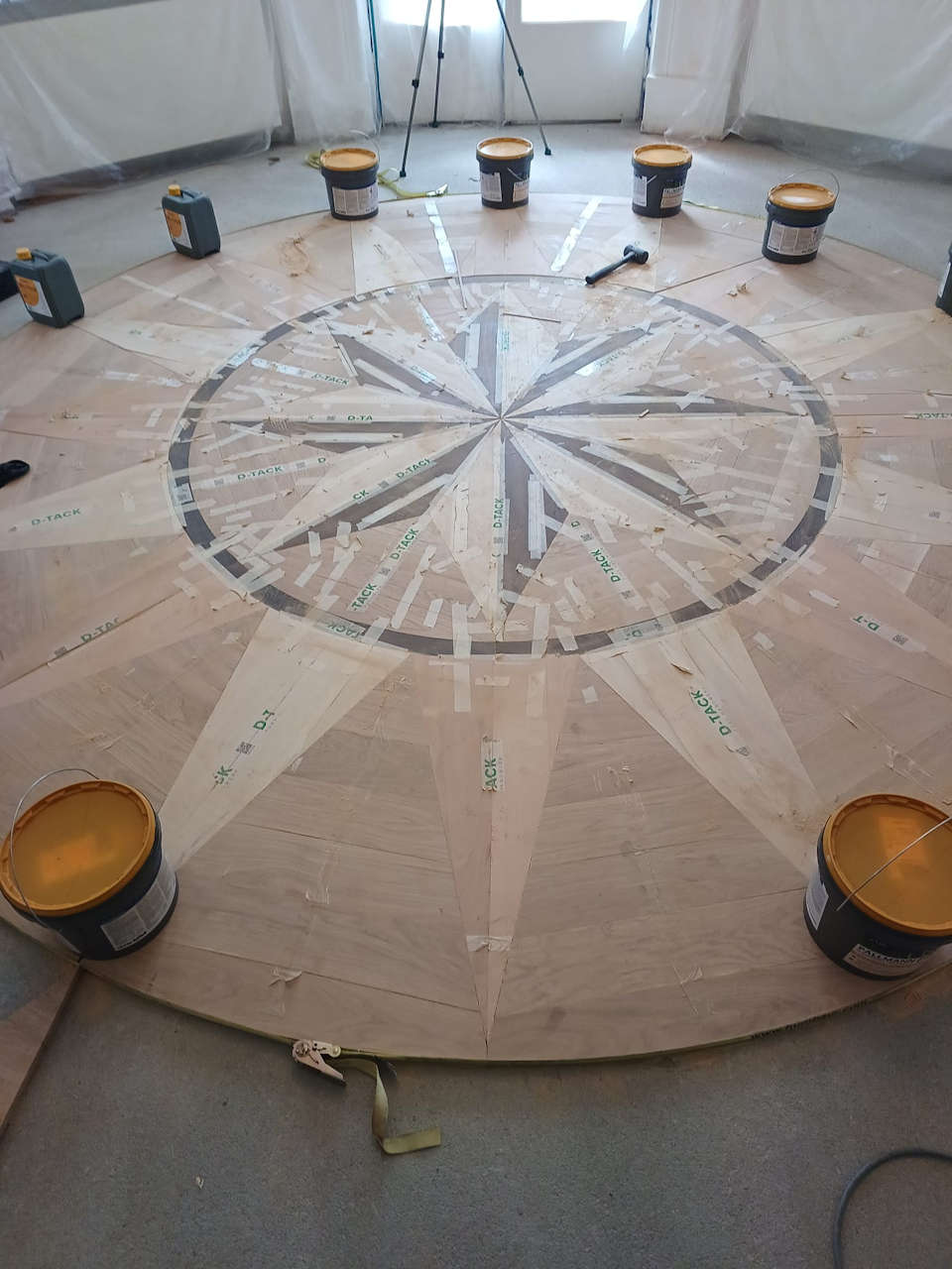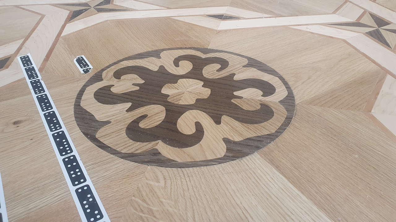- Das Muster wird hergestellt, das verklebte Parkett wird dementsprechend ausgefräst und das Muster wird in das ausgefräste Parkett gesetzt.