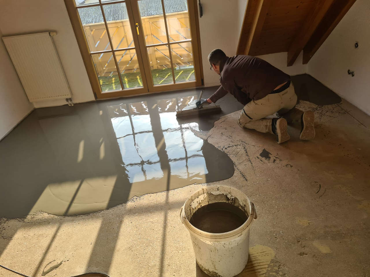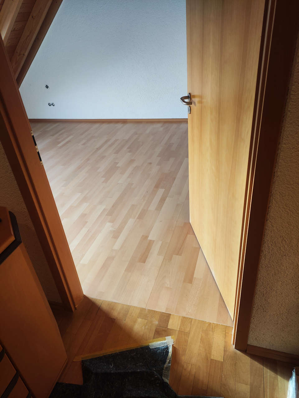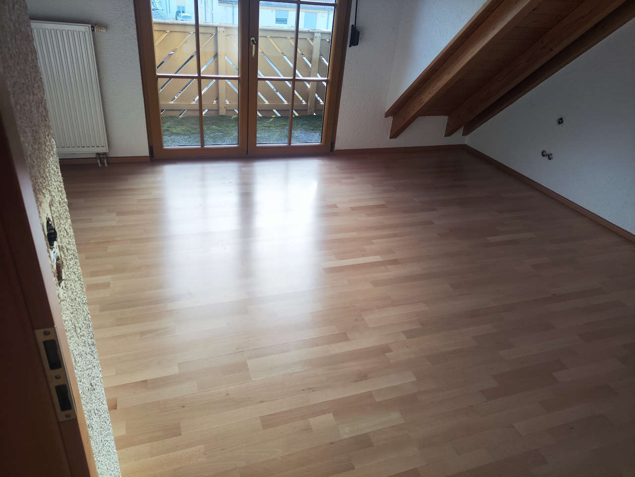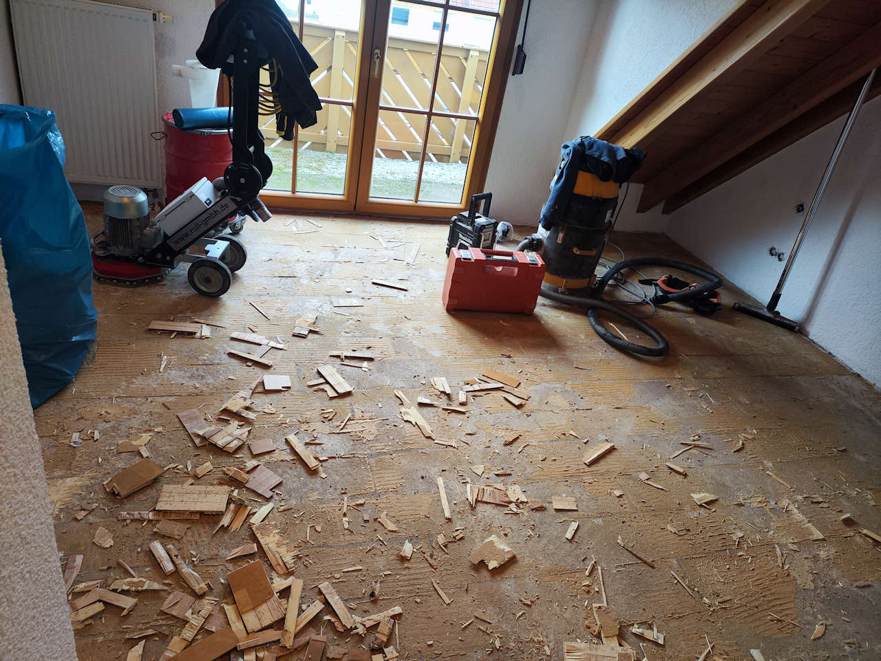 Ausbau altes Parkett wegen leichtem Wasserschaden, Estrich schleifen, spachteln und Neuverlegung Fertigparkett Landhausdiele als Schiffsbodenoptik aus der Holzart Buche gedämpft.