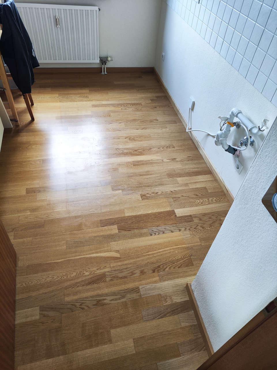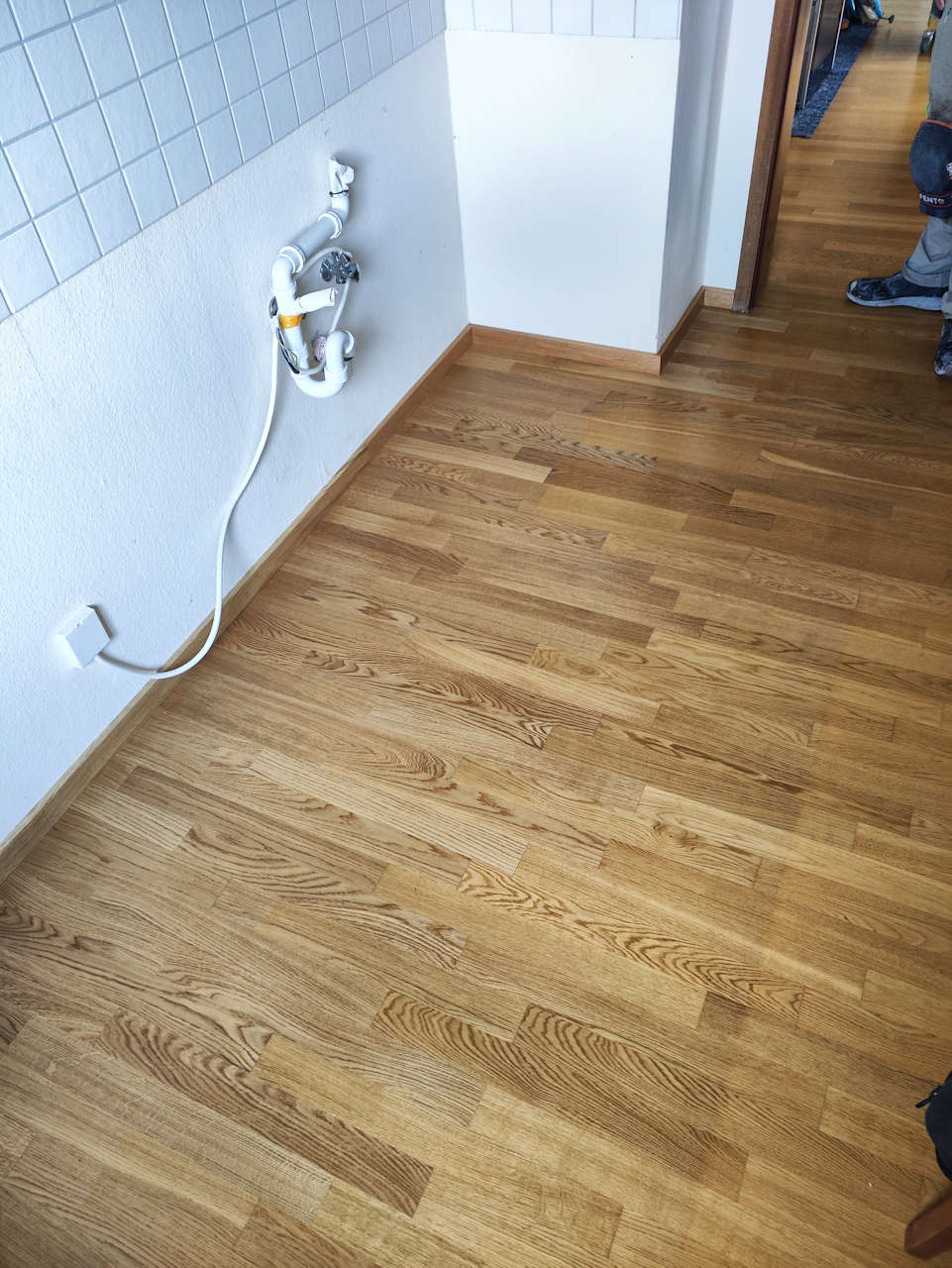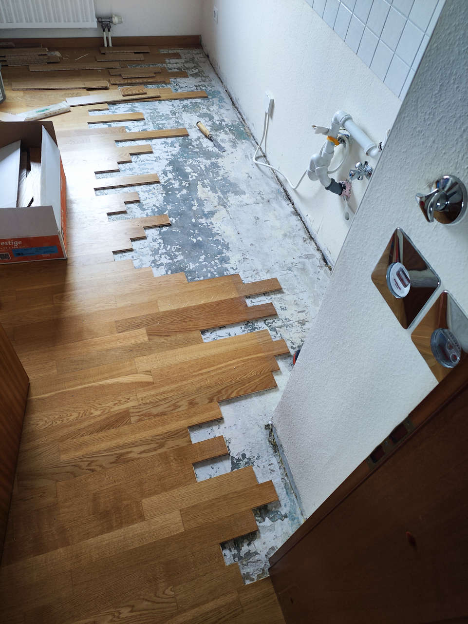 Reparatur eines Fertigparketts aus der Holzart Eiche nach einem Wasserschaden in der Küche
